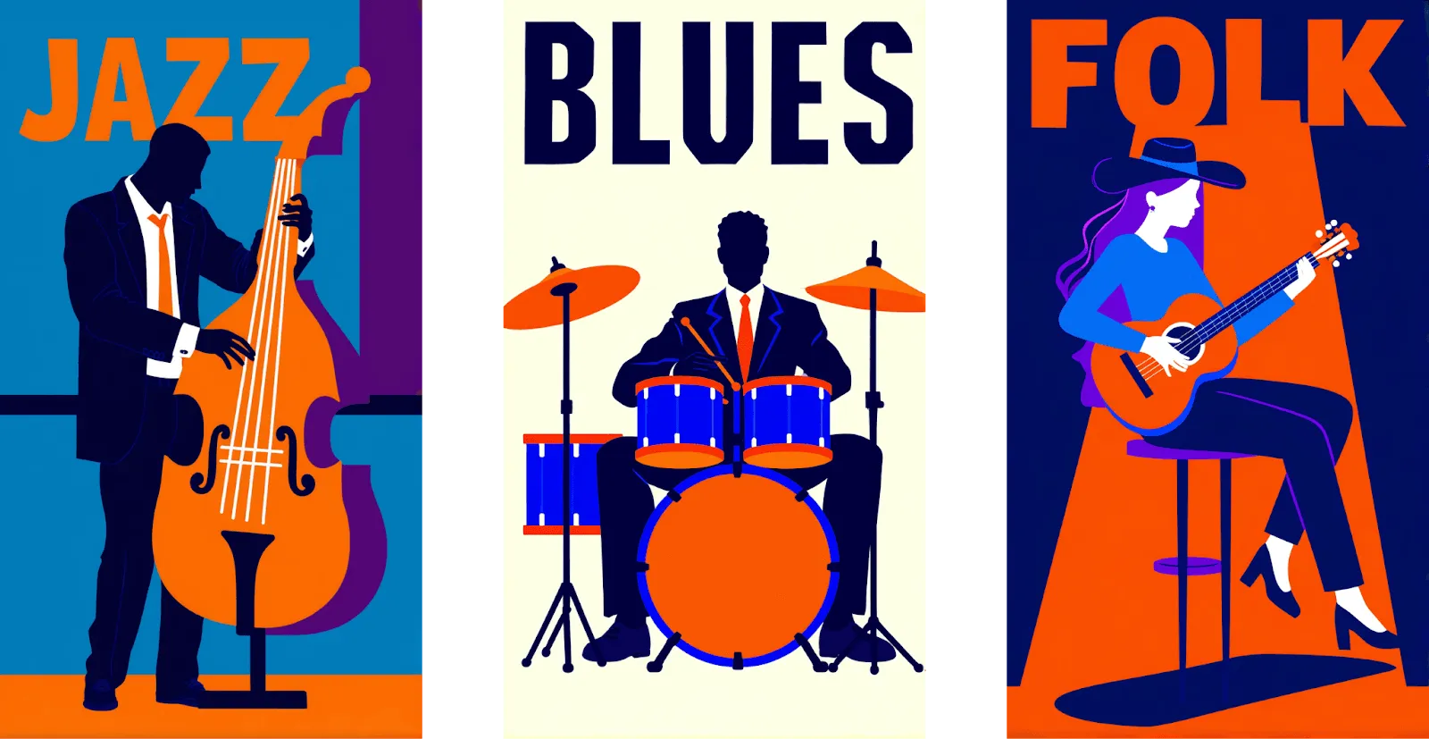 A flat design illustration of a Contrabass player performing on a street corner. The figure is dramatically lit in deep blues, oranges, and purples, with bold shadows and minimalist shapes. The word “JAZZ” is playfully integrated into the scene. The image is a moody blue and orange duotone, evoking soulful atmosphere and rhythm.
