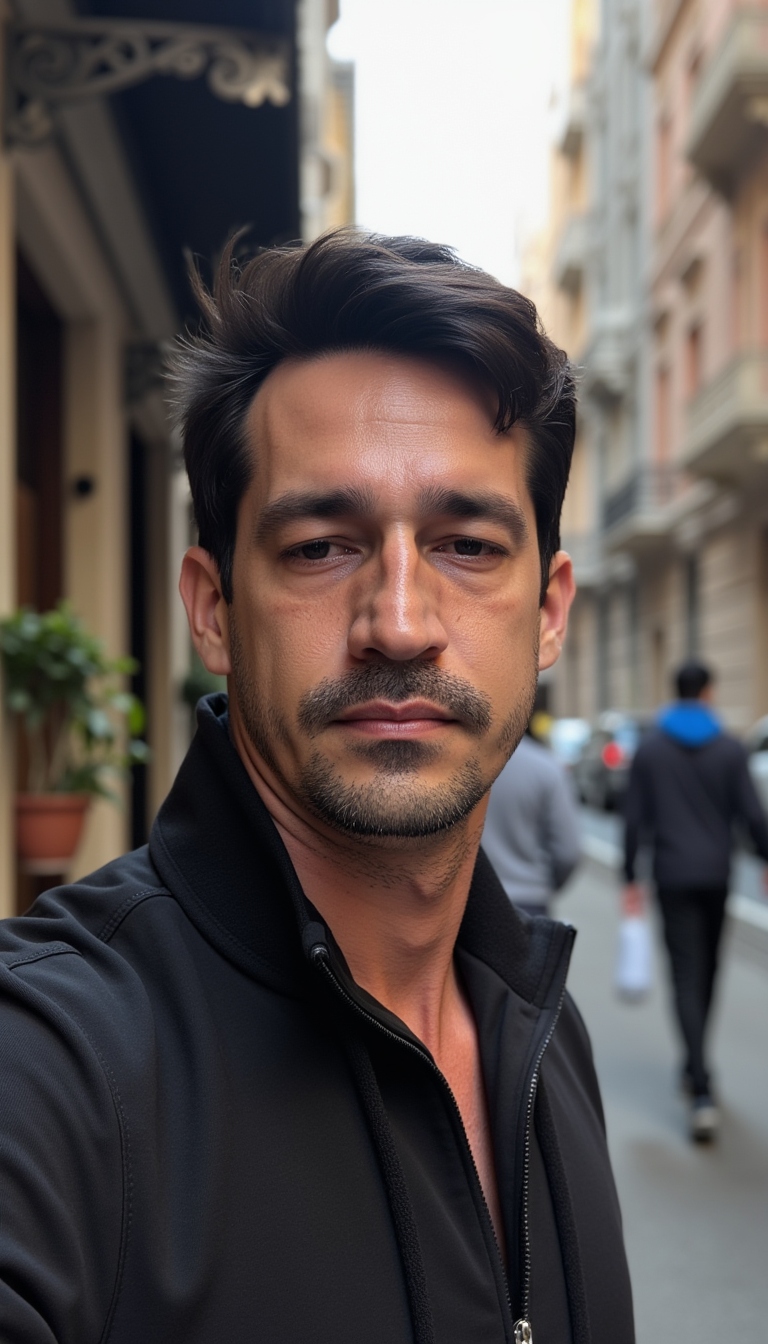 A candid smartphone photo of TOK, a handsome man in his early 30s, [DESCRIÇÃO DA ROUPA], standing in [LOCALIZAÇÃO]. Shot on iPhone 15 Pro, natural morning light, vertical aspect ratio, slightly grainy texture, motion blur, casual pose, authentic skin texture with visible pores and slight imperfections, 4k resolution, raw photography