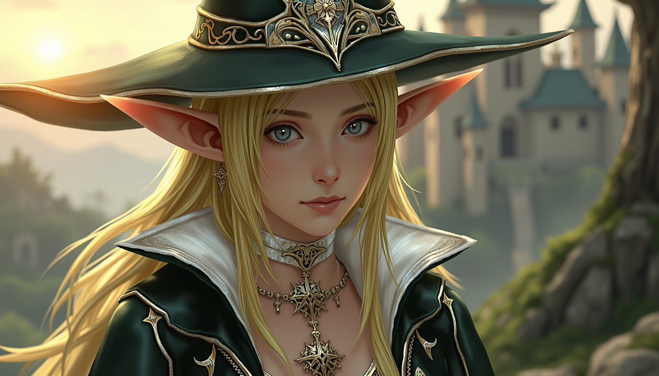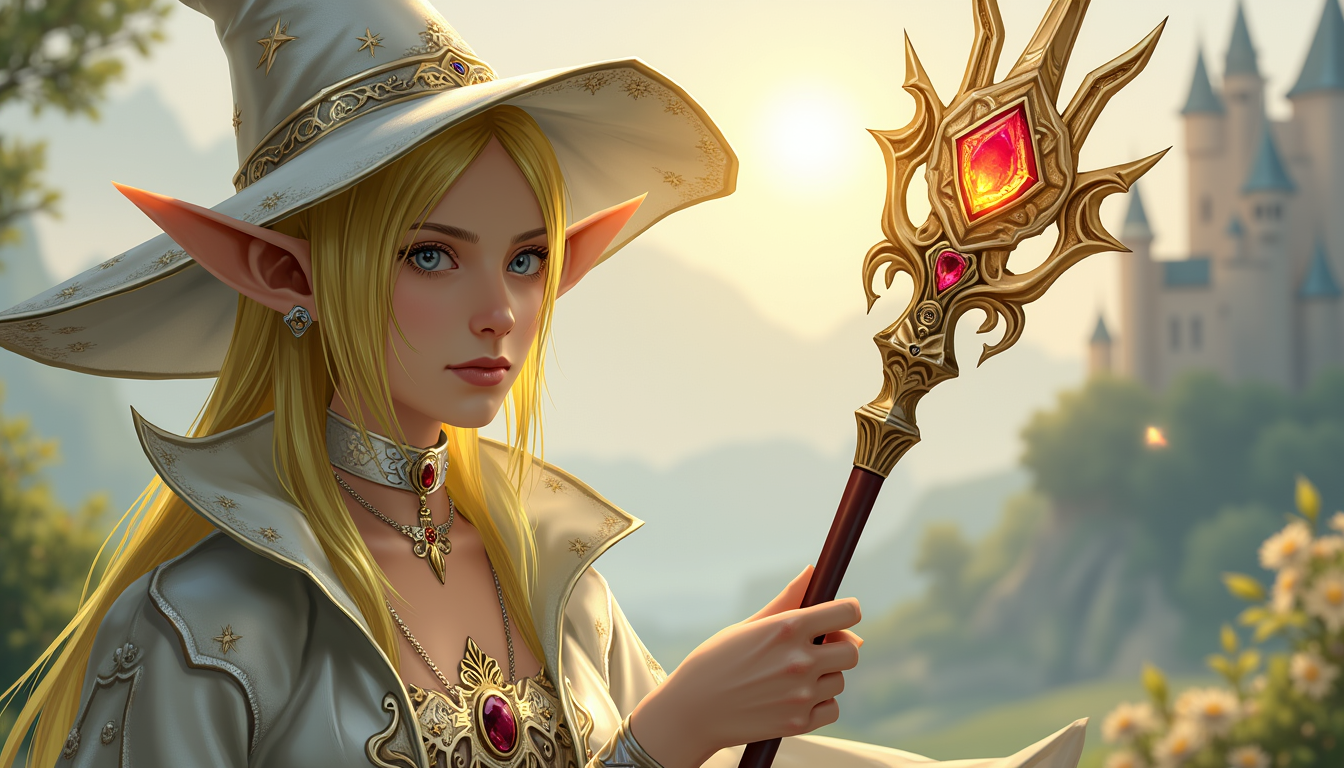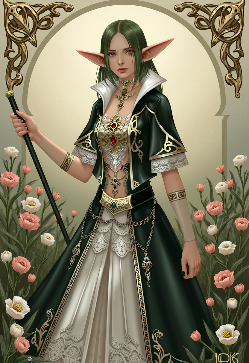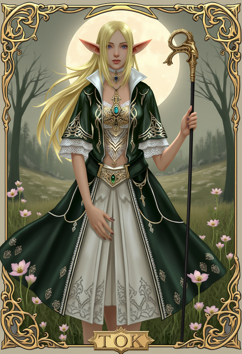 TOK, high-fantasy female elf character with long blonde hair and pointed ears, wearing an ornate black and white dress with intricate gold and silver embroidery, gemstone accessories, and lace details, standing in a neutral background, 3D game render style.