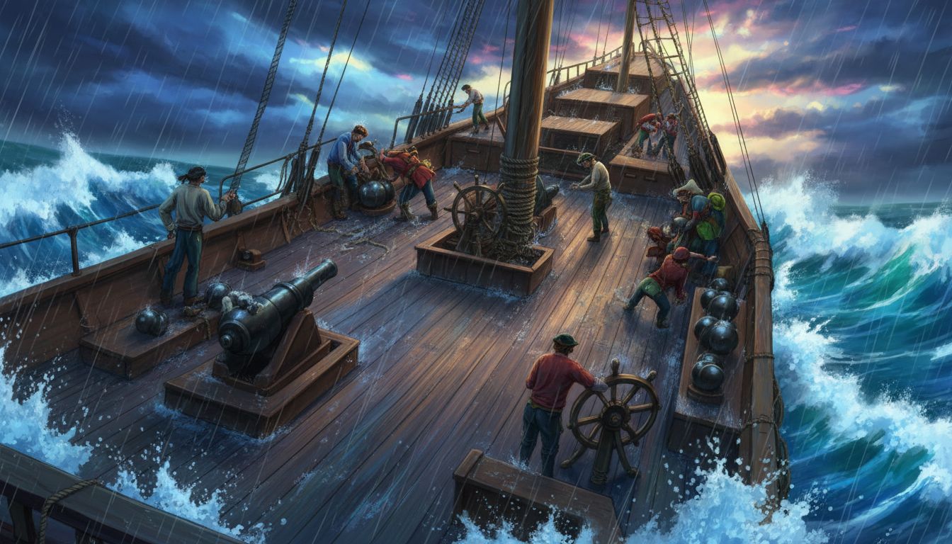 prompt: "slow motion, the slow motionpirates struggle to keep the slow motion boat operating during a slow motion swell. Slow motion. Vibrant.",