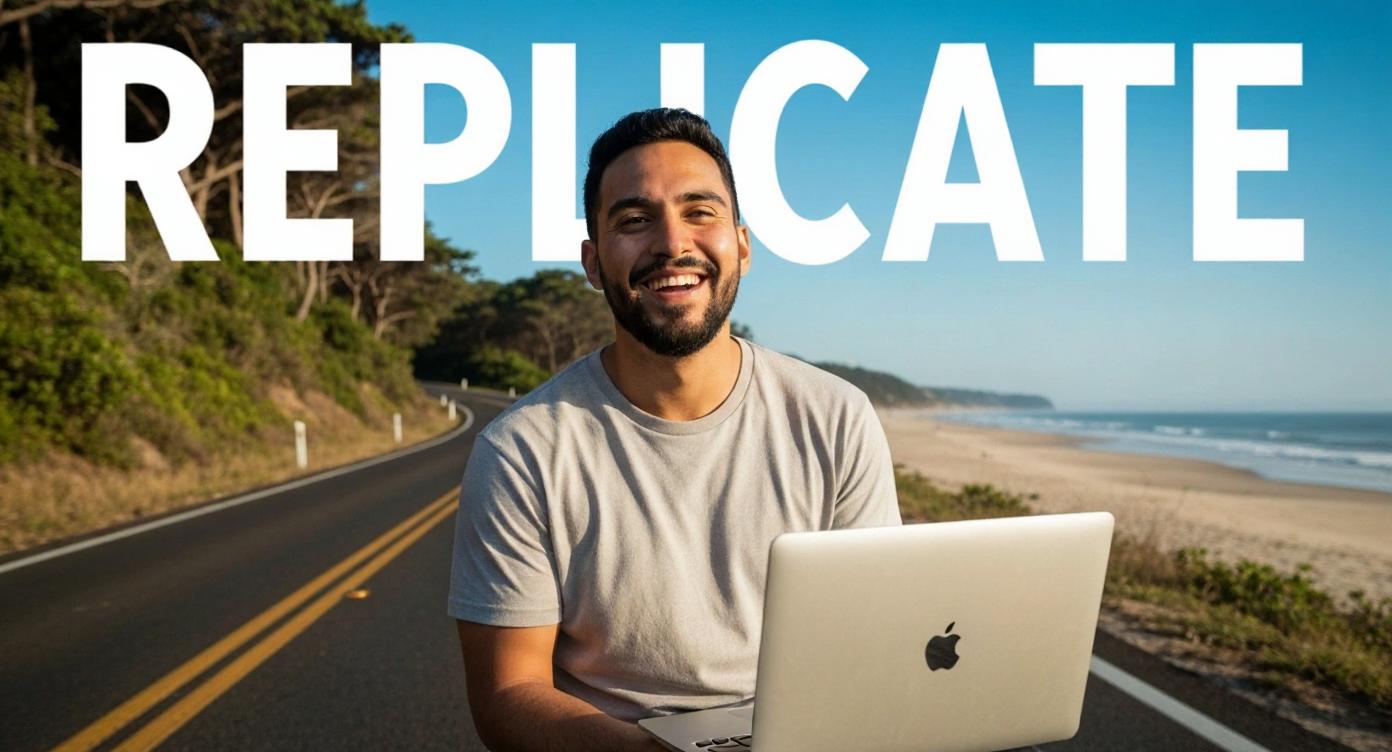 prompt: "Add giant text behind the man that spells out \"REPLICATE\" in huge aesthetic letters",