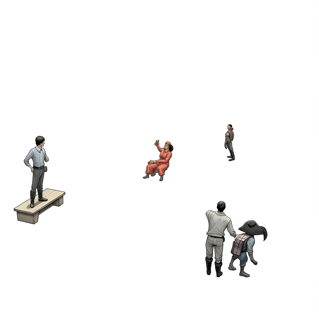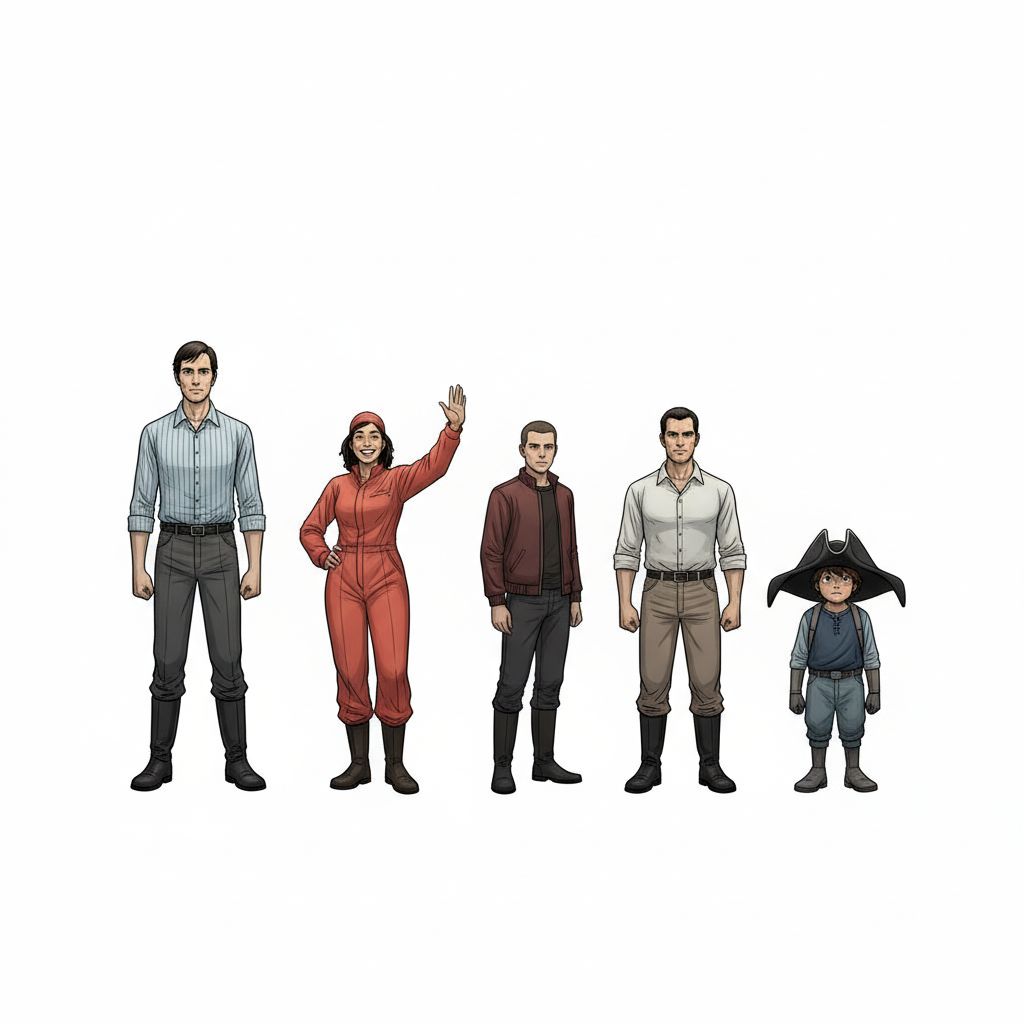 "prompt": "Set these pirates up so they are front facing, high detail, and standing facing the camera from tall to short"