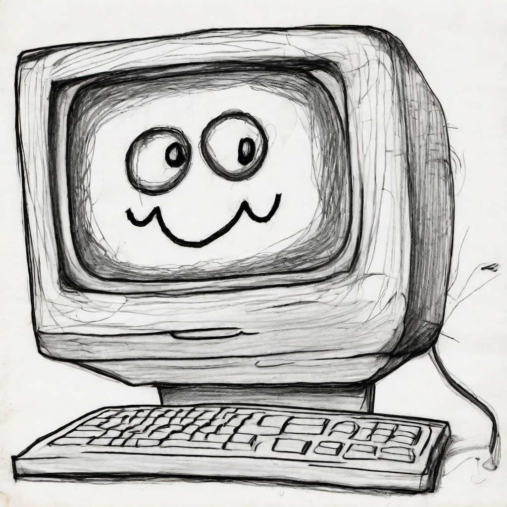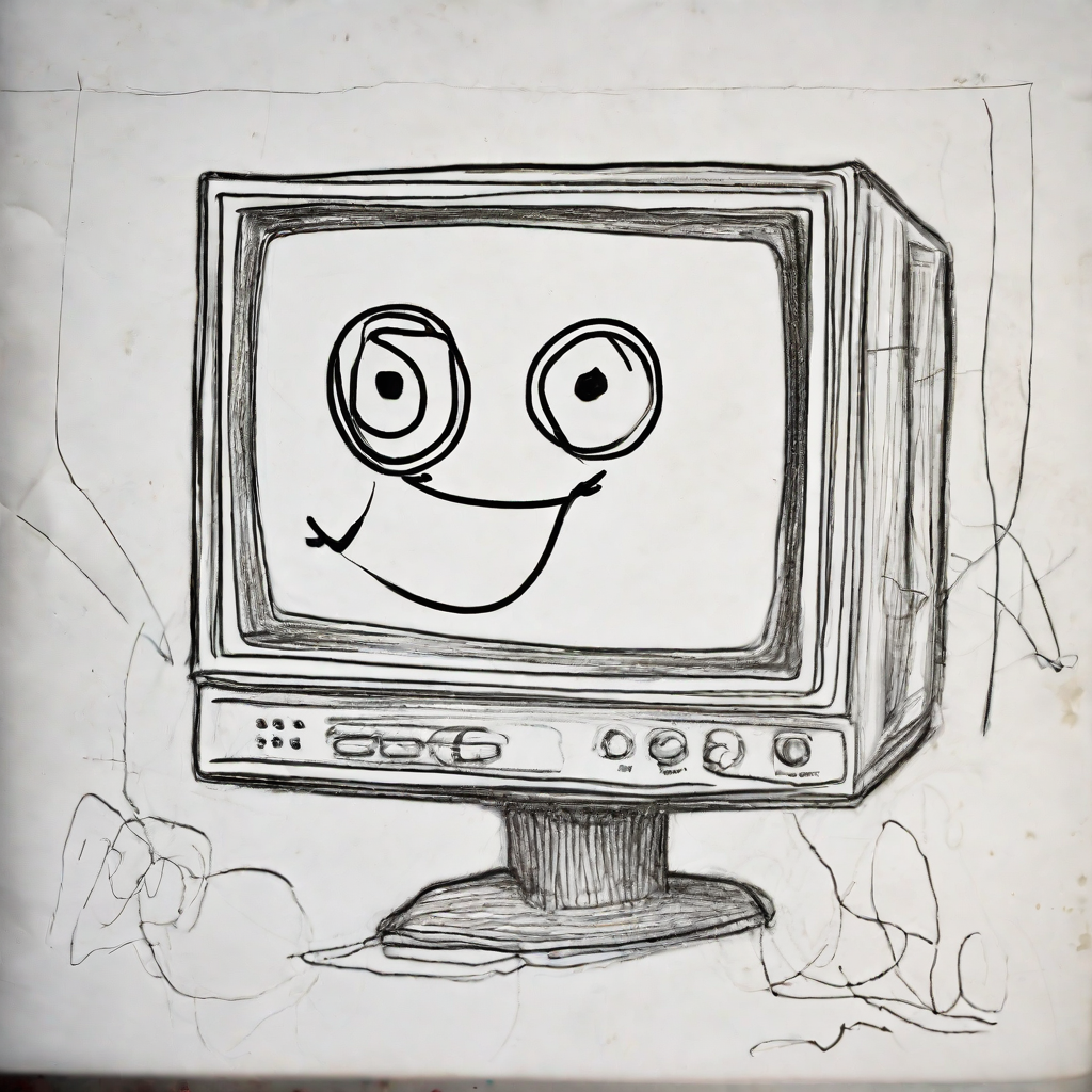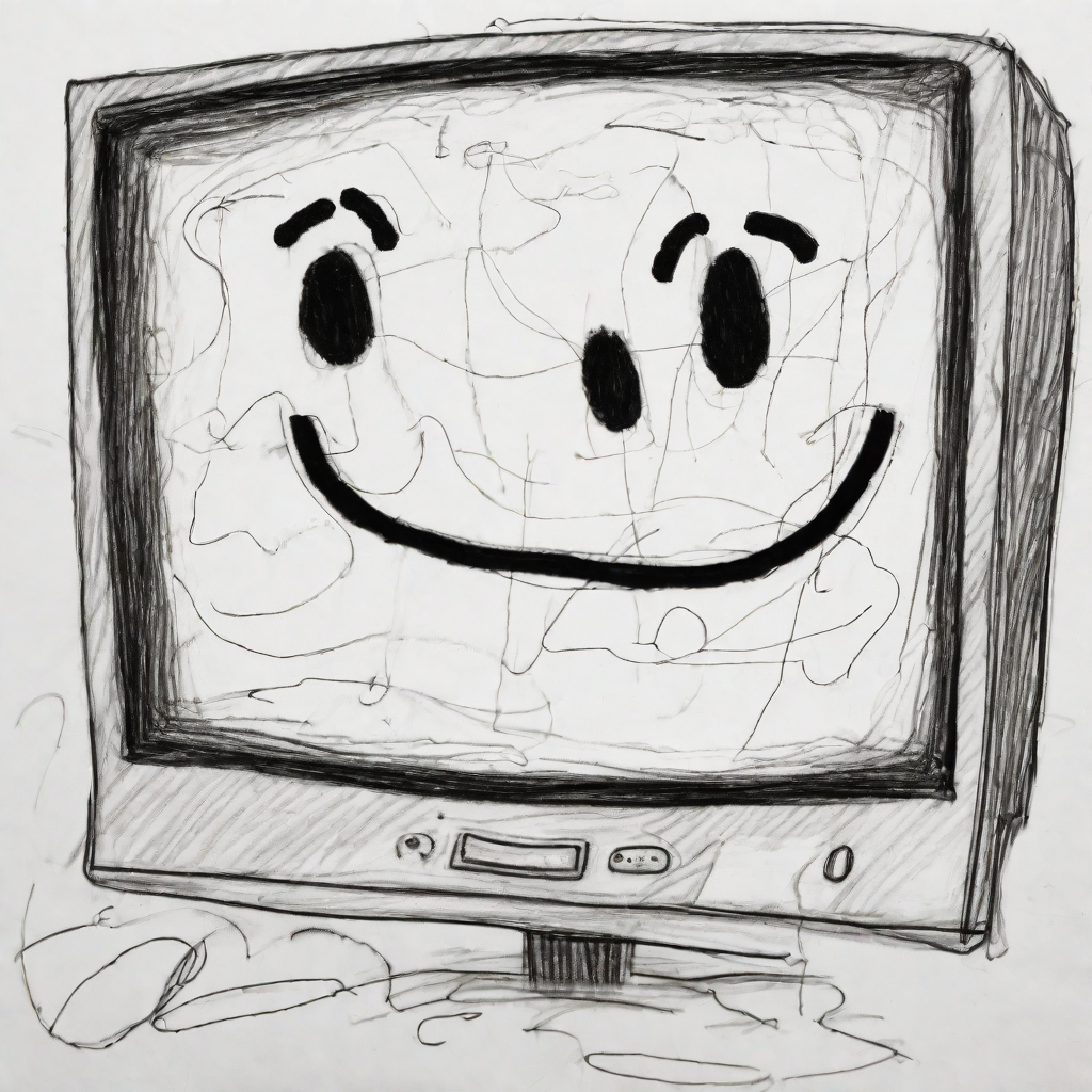 prompt: "a pencil drawing made by a 3 year old child, the drawing shows a badly drawn old smiling computer monitor, loose lines, scribbles, badly drawn, funny",