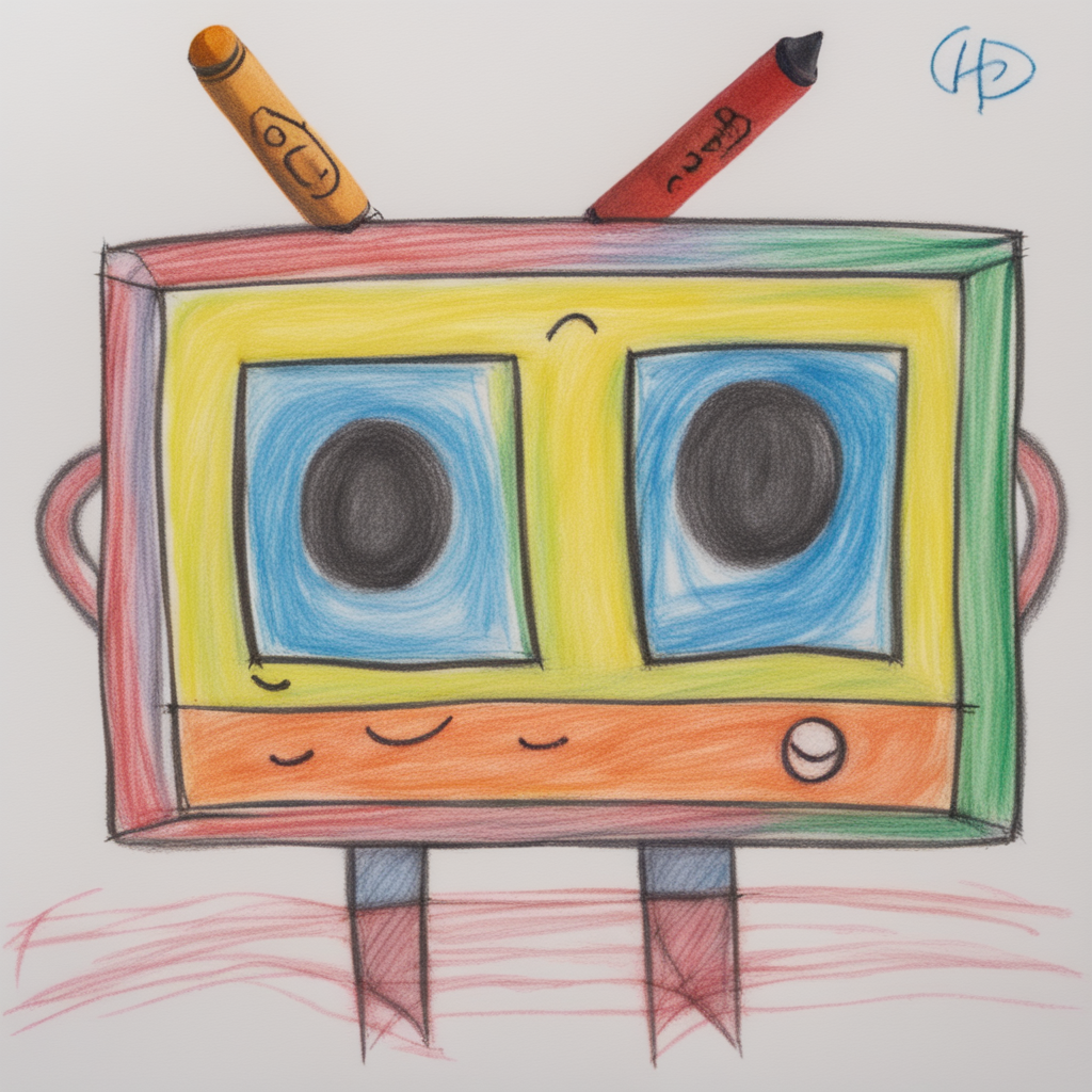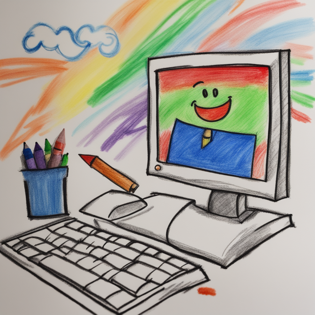 prompt: "a colorful crayon drawing made by a 5 year old child, the drawing shows a smiling computer, crayon on paper, badly drawn,",