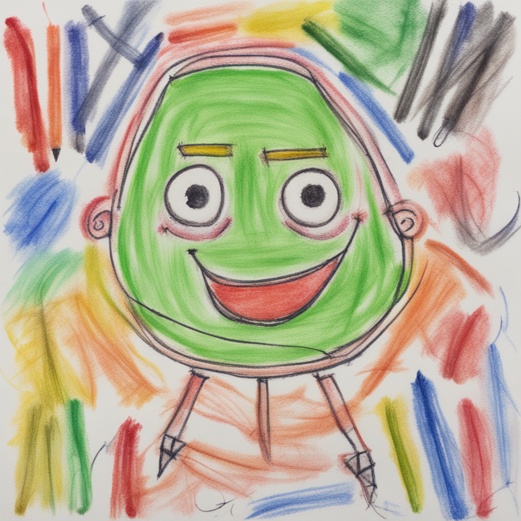"prompt": "a colorful crayon drawing made by a 5 year old child, the drawing shows a smiling computer, crayon on paper, badly drawn,",