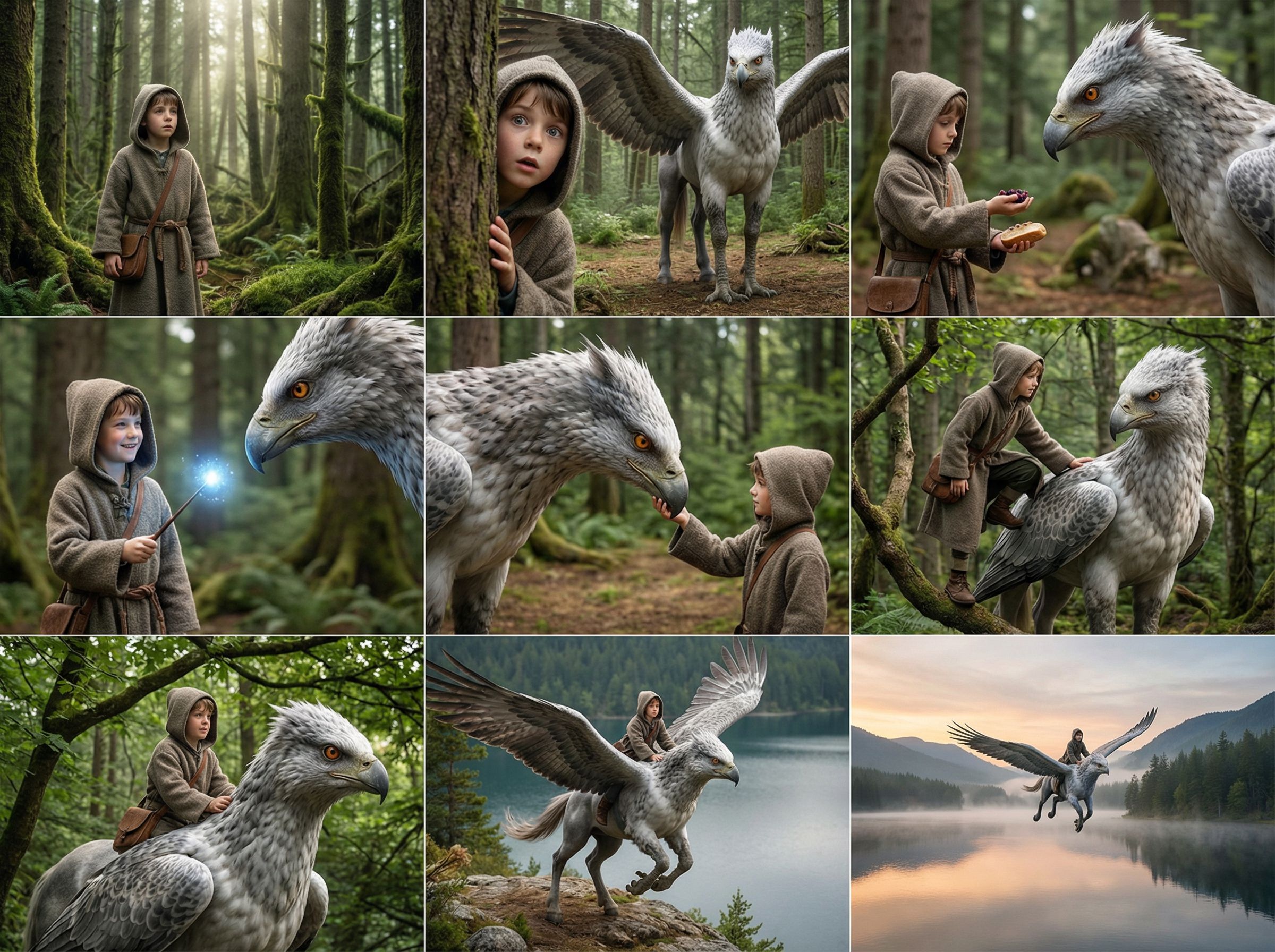 prompt: "Create a 3x3 grid of a story of a wizard boy in the forest, meets a Hippogriff, brings it food, shows it magic, climbs the Hippogriff, and rides it over a lake. Realistic style",